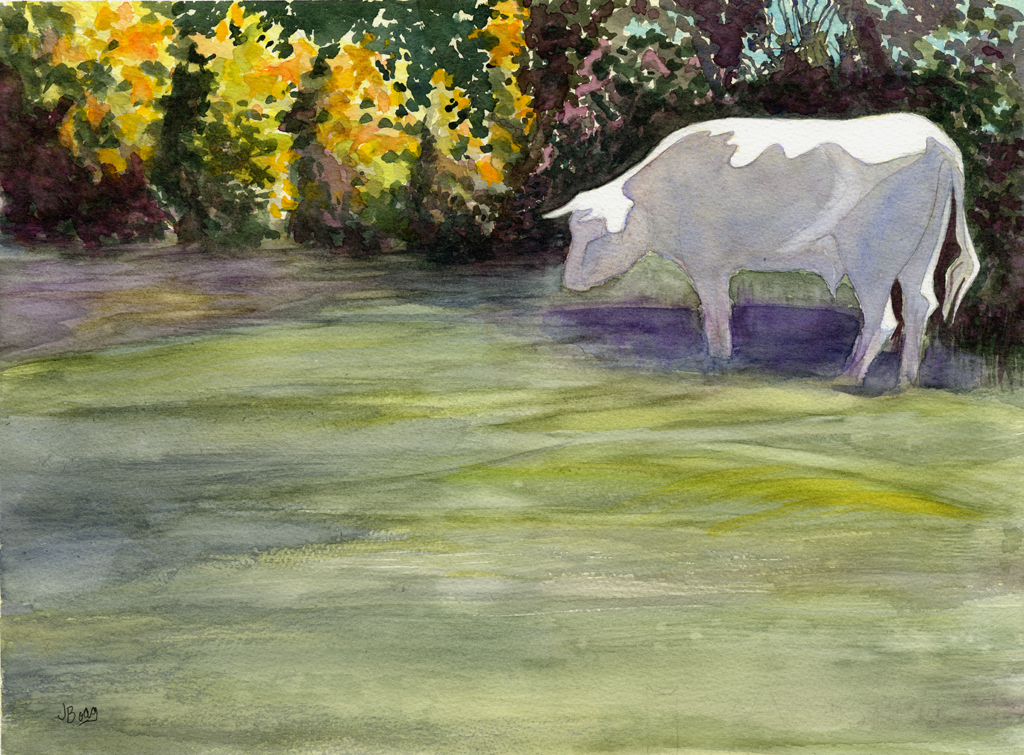 Several years ago I attended a bullfight in Spain. The last bull released into the ring was smaller than the others. He seemed confused, trotting from one side of the ring to another…and another…and still another…for several minutes, stopping and looking each time at the crowd as if to say, ‘Where am I? Who are you? What are we doing here?’ I was in the front row and could clearly see the expression in his eyes as he stood directly in front of me. My empathy for the little bull moved me to tears, and sounds from the crowd told me I was not alone. And then the horrific slaughter that is misnamed ‘bullfighting’ began. The bull never wins. This painting is my eulogy to him in watercolor. It comforts me to imagine him free now, kissed by sunlight in a lush field where no one will harm him.